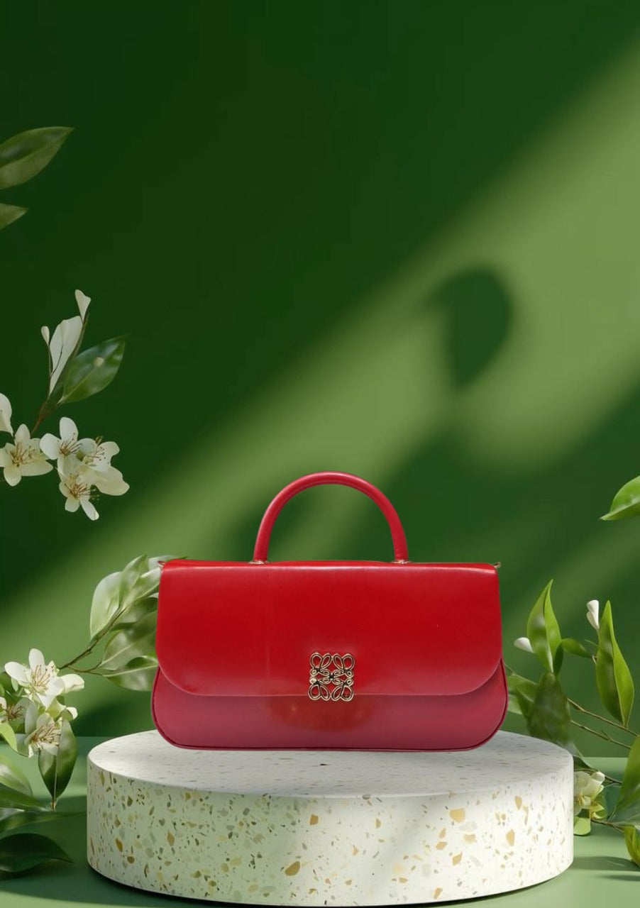 Turn heads with this stunning red glossy handbag, a perfect blend of timeless elegance and modern charm. Its sleek silhouette is enhanced by a delicate gold ornamental clasp, adding a touch of luxury to your outfit. Designed with a structured body and sturdy top handle, this bag is ideal for both special occasions and everyday sophistication.